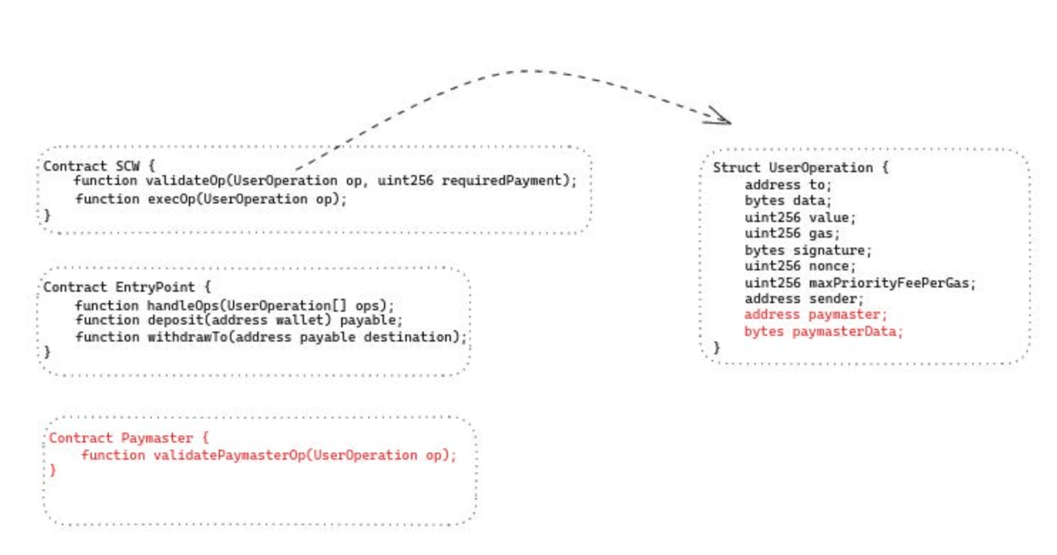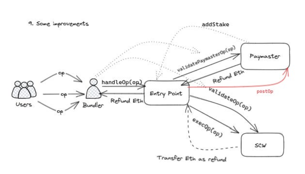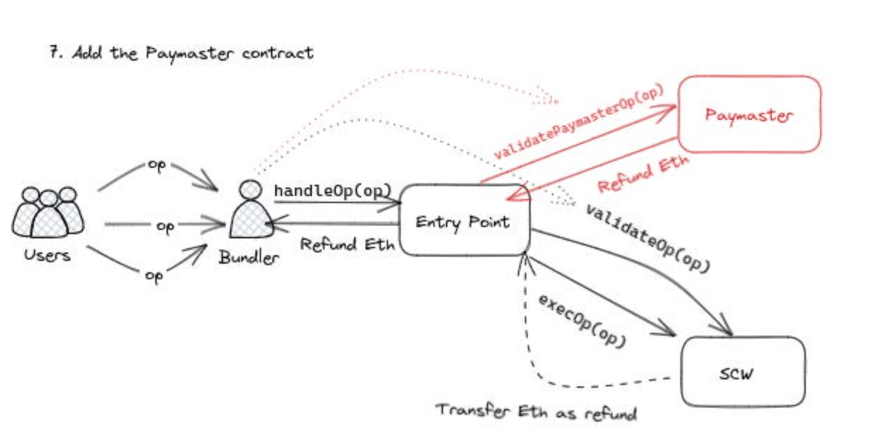 The current design still requires the user themselves to pay for the gas with Ether, we can do this by introducing a Paymaster contract to pay for the gas, again we need to validatePaymasterOp to ensure it doesn't generate nefarious behavior.