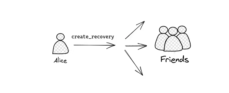 If you want to enable social recovery on your account, you need to specify the relevant configuration in the chain, which we do by calling the create_recovery function in the specific implementation. Let's take the example of Alice, who has configured her account for social recovery.