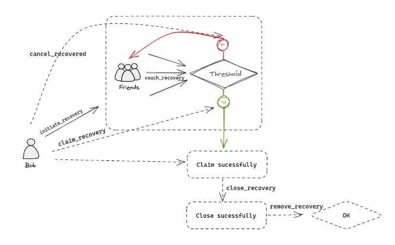 The next piece of code is a call to initiate social recovery from a friend who needs the social recovery account to be set up in advance. Accounts in Alice's previously set friends list can be helped to complete social recovery by calling the vouch_recovery function, which can be canceled by Bob via cancel_recovered until a threshold is reached.